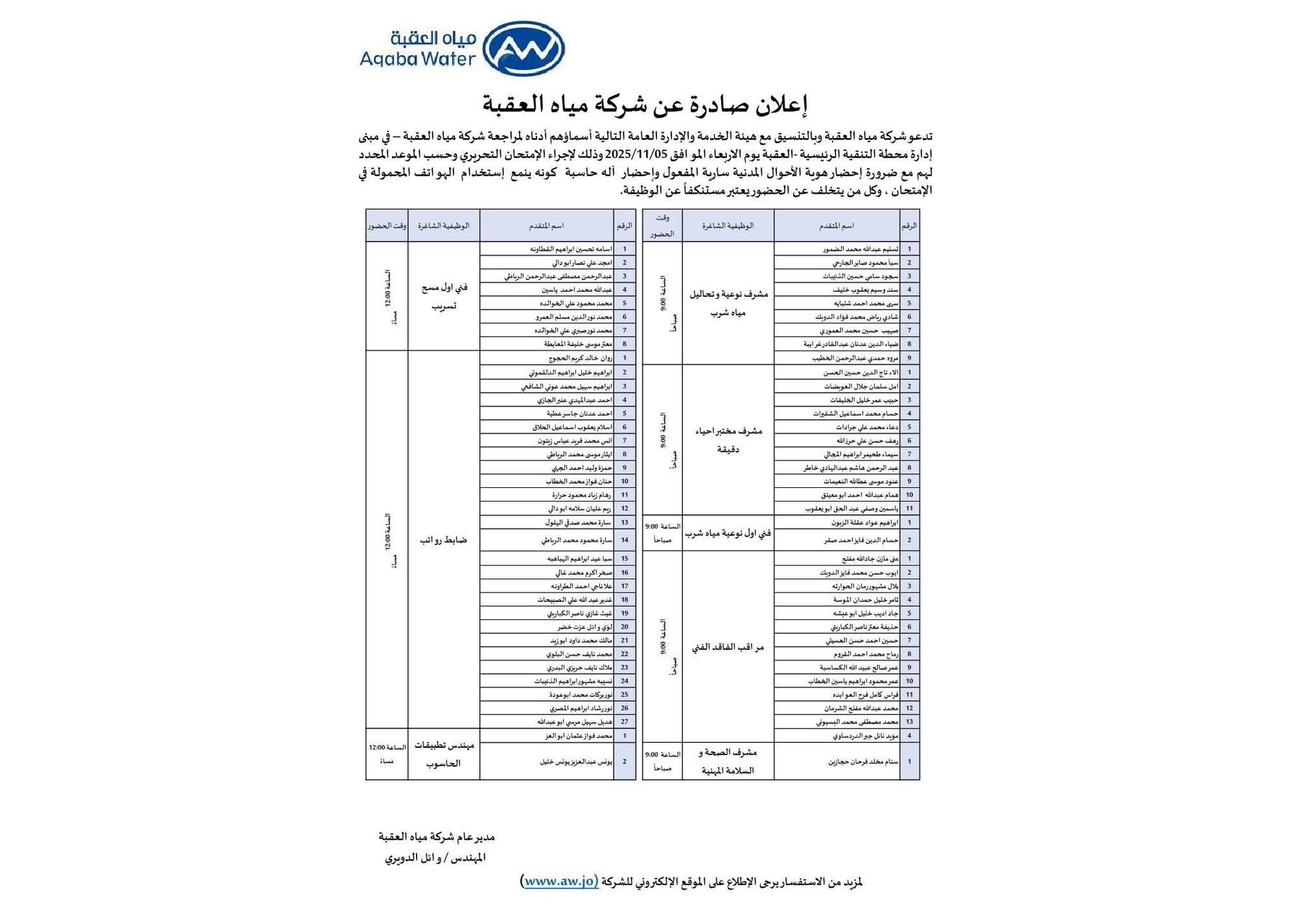 تدعو شركة مياه العقبة وبالتنسيق مع هيئة الخدمة والإدارة العامة التالية أسماؤهم أدناه لمراجعة شركة ...