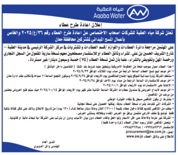عطاء 35/ع/2025 تمديد خطوط مياه في اجزاء متفرقة في المنطقة الرابعة – العقبة (تميد بيع)