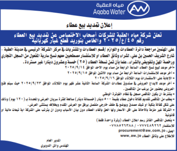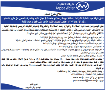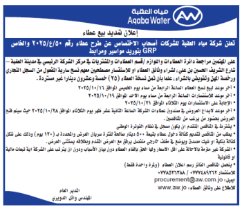 عطاء 35/ع/2025 تمديد خطوط مياه في اجزاء متفرقة في المنطقة الرابعة – العقبة (تميد بيع)